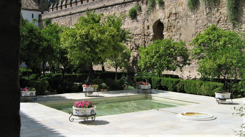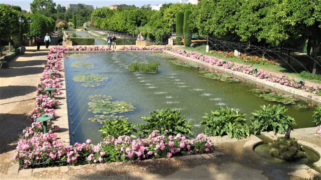 En el patio interior dos pequeñas fuentes de mármol blanco vierten agua en sendos estanques y varias fuentes más en las zonas sombreadas de los jardines invitan a descansar escuchando el sonido del agua y el canto de los pájaros. Al final de los grandes estanques, sobre restos de una construcción romana y con fondo de un mosaico creado al efecto, la llamada «Fuente del Plátano» proyectada por José Rebollo en 1956 recuerda que, según el poeta Marcial cuyas estrofas está esculpidas en el frontal, Julio Cesar plantó un plátano de indias durante su estancia en Córdoba.