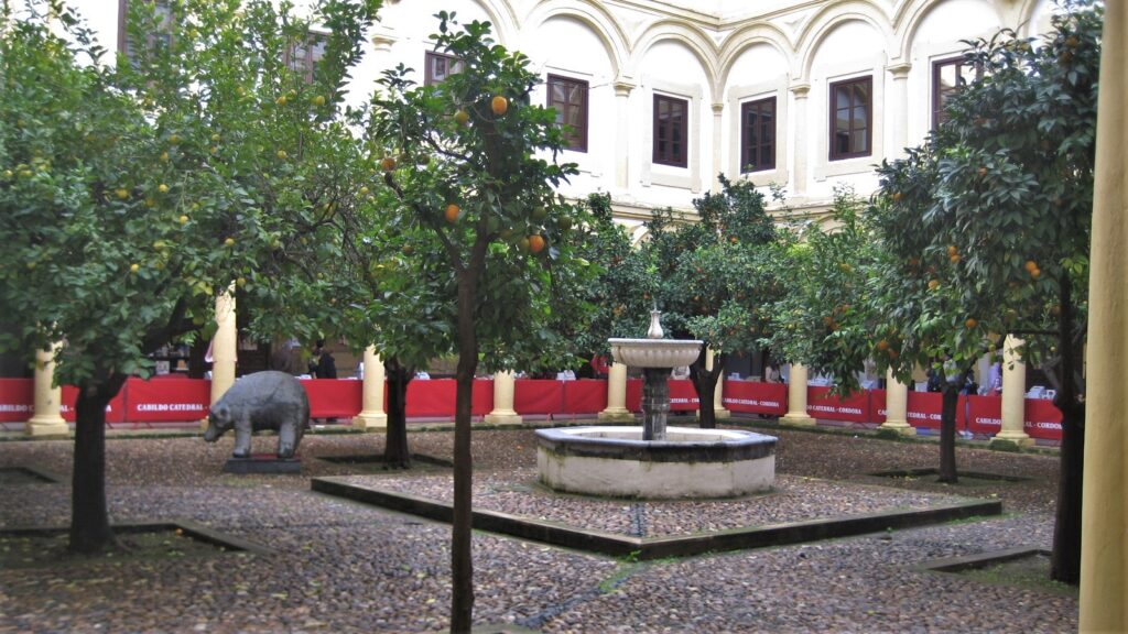 El patio porticado y empedrado de este palacio, ahora Museo Diocesano, situado frente a la Mezquita se adorna con una fuente de pilón octogonal y pedestal central que soporta una taza sobre la que mana un surtidor. Muy cerca de ella parece «pastar» el elefante original que da nombre a la fuente próxima al barrio cordobés de Trassierra.