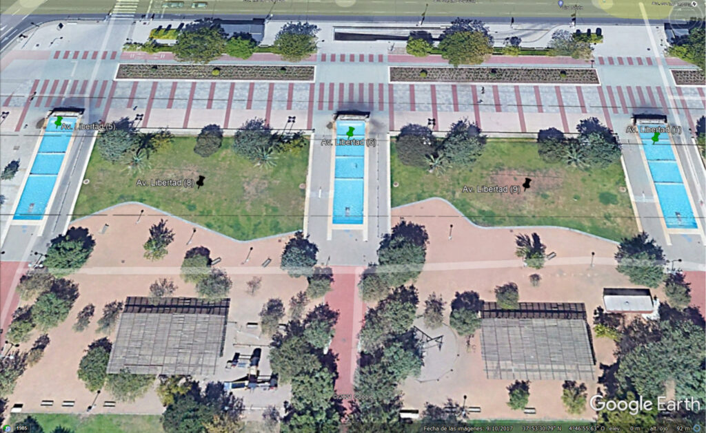 En relación con estas fuentes, gracias a Google Earth he descubierto que entre 2011 y 2017 fueron eliminados dos estanques en los jardines situados entre la Avda. del Gran Capitán y la Gta. de Llanos del Pretorio. Esta es la prueba de ello, son los marcados con «chincheta» negra.