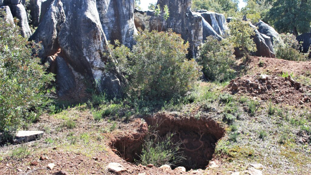 Aquí comienza lo más peligroso de nuestro paseo, por la existencia de agujeros a veces casi ocultos entre el matorral y paredes muy propicias a desprendimientos de los que hay sobradas muestras…